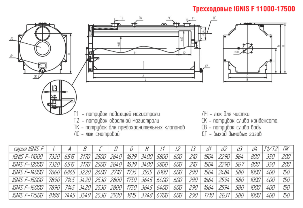 Технические характеристики водогрейного трёхходового котла ARCUS IGNIS F-15000