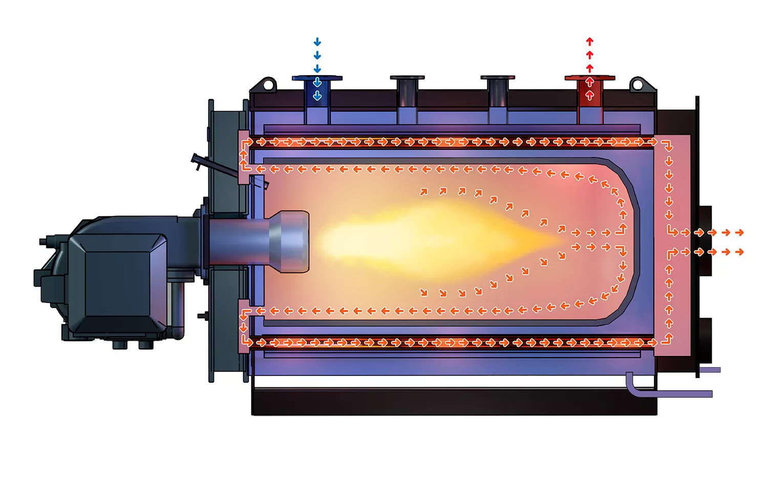 Котел серии «PREMIUM-Е» представляет собой трехходовую газотрубную конструкцию горизонтального исполнения, изготовленную из стали. Это жаротрубный котел, оснащенный дымогарными трубами, с теплоизоляцией из сверхтонких базальтовых матов, закрытой декоративной защитной облицовкой.