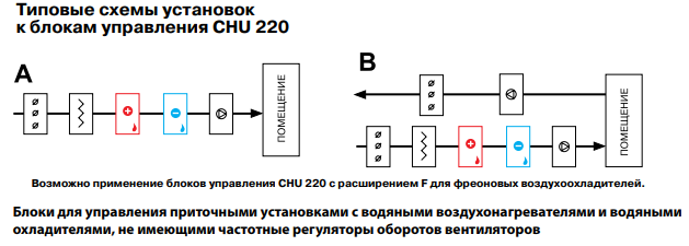 Блок управления CHU 220-W-11 предназначен для управления приточно-вытяжной установкой вентиляции с водяным воздухонагревателем и водяным охладителем.